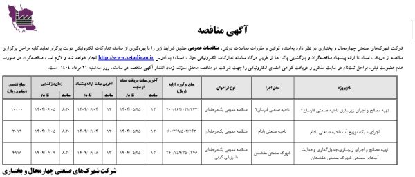 شرکت شهرکهای صنعتی چهارمحال و بختیاری در نظر دارد بهاستناد قوانین و مقررات معاملات دولتی، مناقصات عمومی مطابق شرایط زیر را با بهرهگیری از سامانه تدارکات الکترونیکی دولت برگزار نماید.کلیه مراحل برگزاری مناقصه از دریافت اسناد تا ارائه پیشنهاد مناقصهگران و بازگشایی پاکتها از طریق درگاه سامانه تدارکات الکترونیکی دولت (ستاد) به آدرس http://www.setadiran.ir انجام خواهد شد و لازم است مناقصهگران در صورت عدم عضویت قبلی، مراحل ثبتنام در سایت مذکور و دریافت گواهی امضای الکترونیکی را جهت شرکت در مناقصه محقق سازند. زمان انتشار آگهی مناقصه در سامانه، روز سهشنبه ۲۱ مرداد ۱۴۰۴ است.